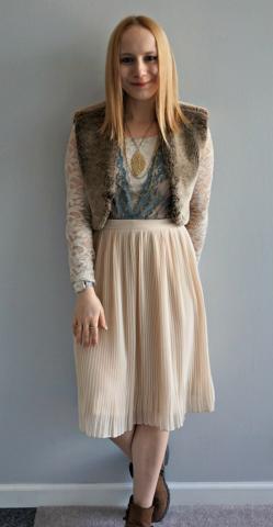 I was trying to think of a way to twist up the classic look of a lace outfit. What could complement this texture? Some more texture, of course! Nothing gives a look texture more than fur. Along with that it gives a very contrasting element to this piece by having the light lace alongside the dark fur.